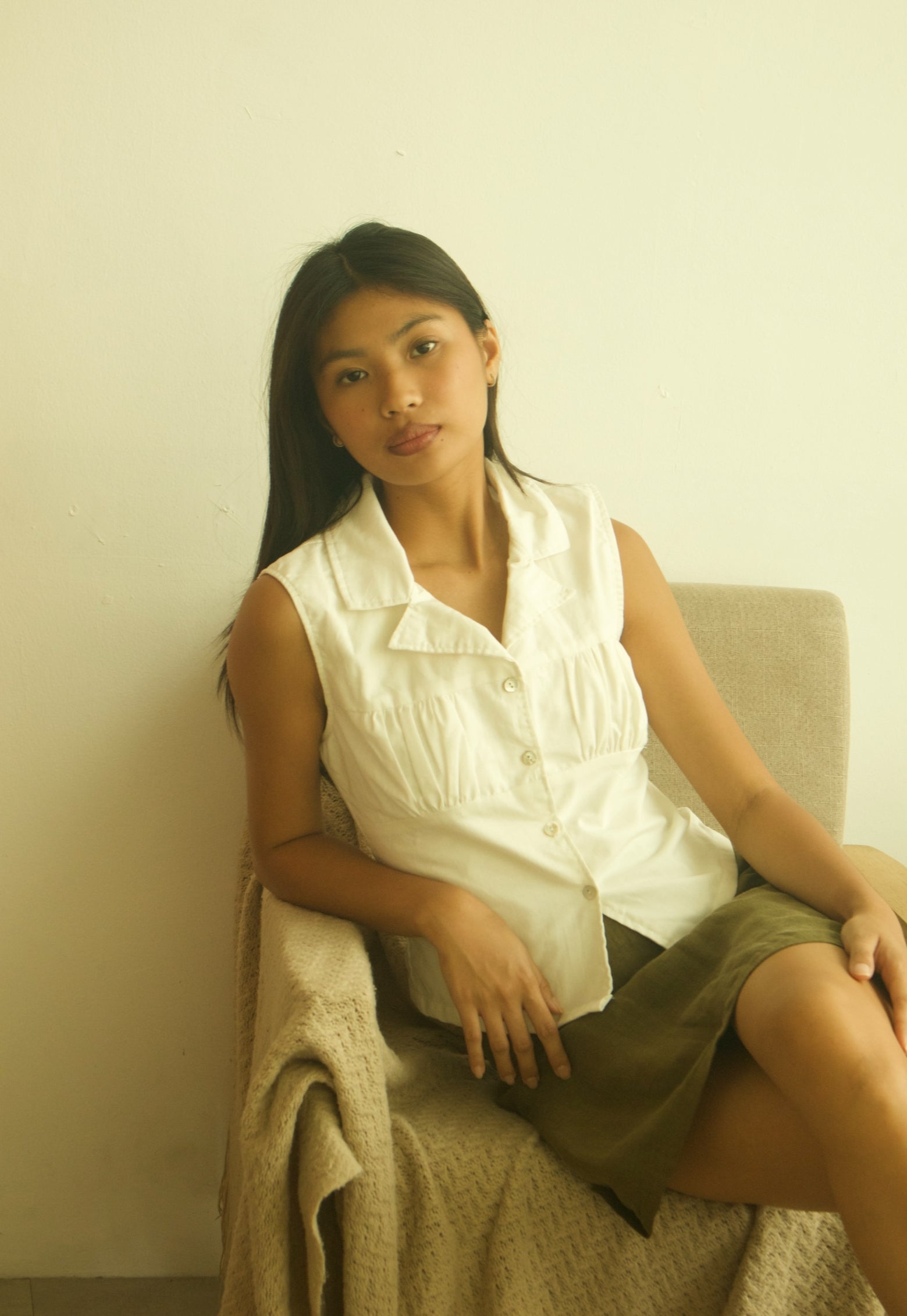 Memo Vest — the brunch-ready, sleeveless sister of the Ivy Polo. Same relaxed boxy fit, in a sleeveless silhouette detailed with delicate bust shirring, and miniature capiz shell buttons for an understated feminine finish. A refined, dress-code-friendly piece that’s anything but boring.