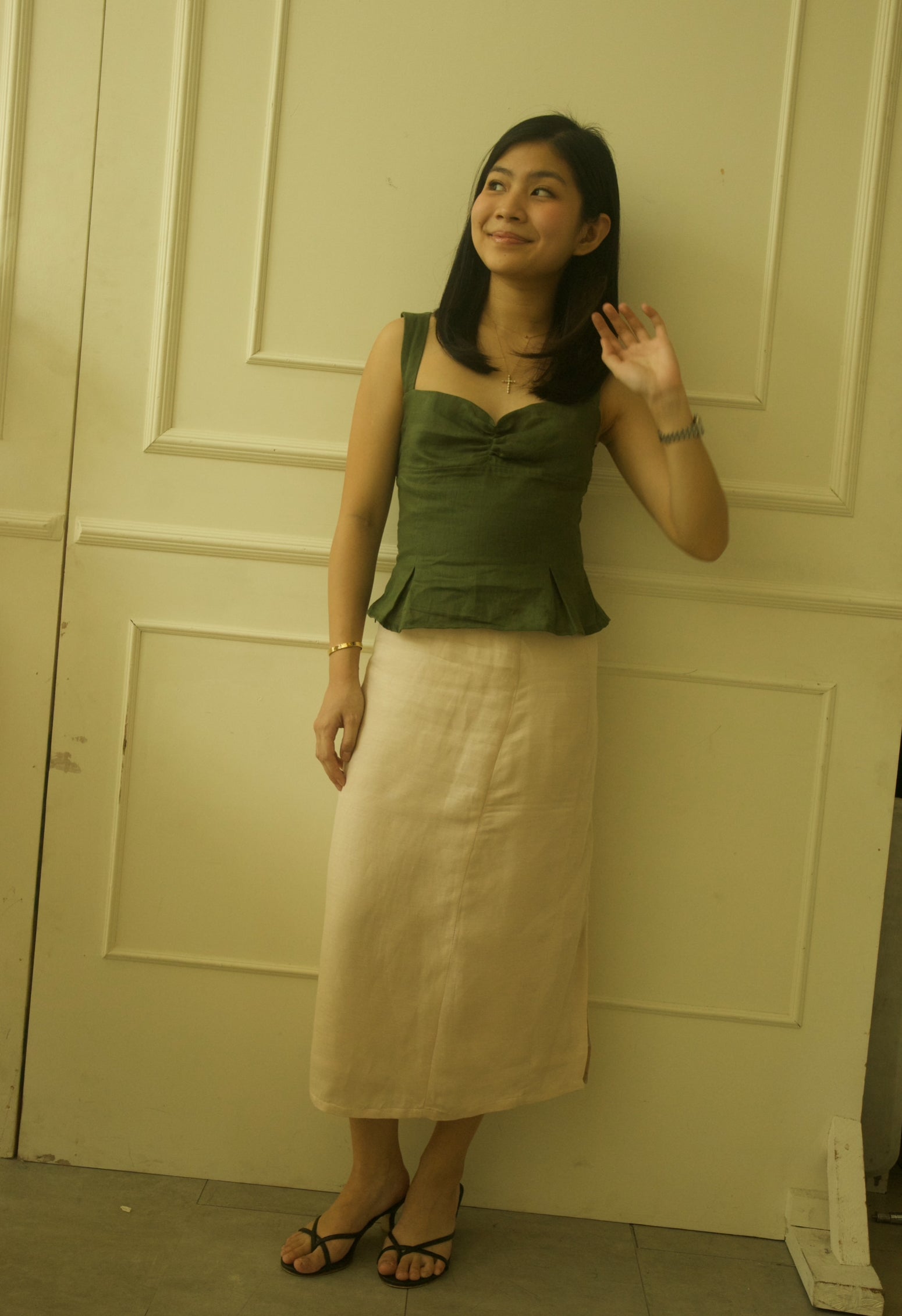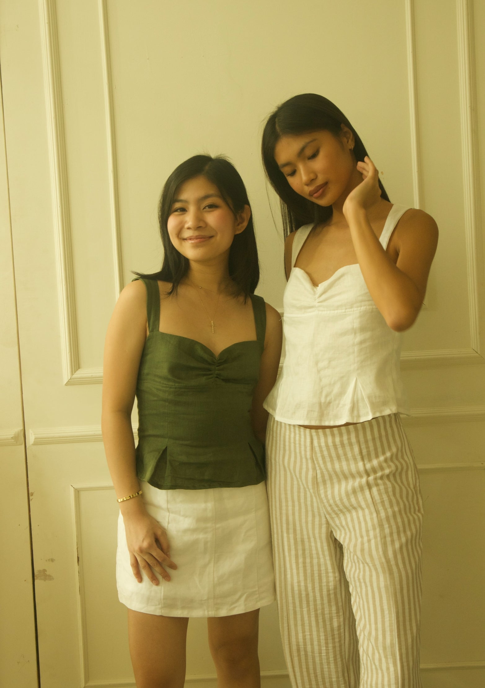 - Chloie wears White in S; Belle wears Fern in XS
